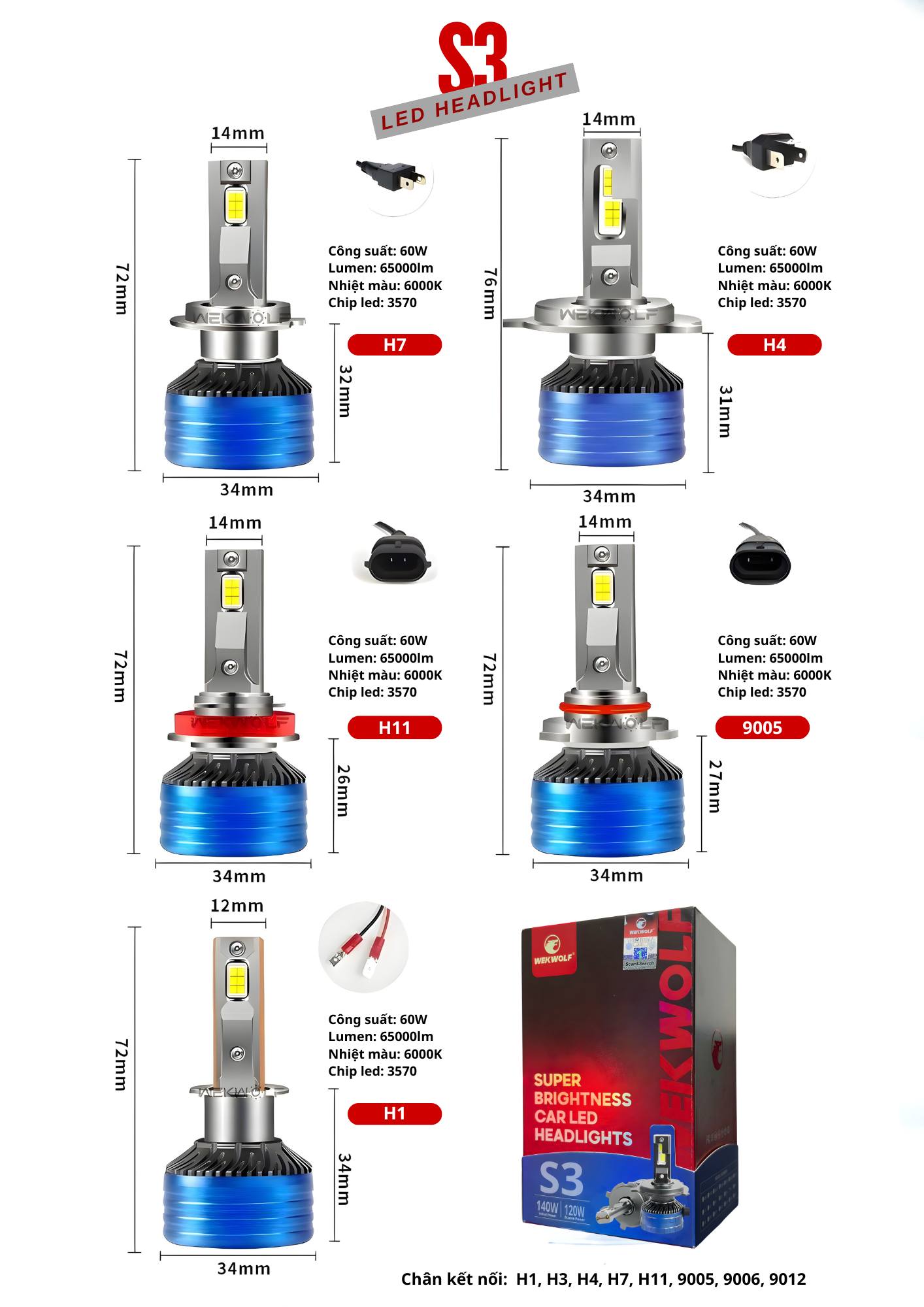 ⚙️ Thông số kỹ thuật LED S3 chân 9005 WEKWOLF